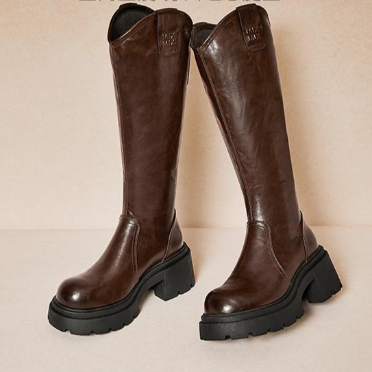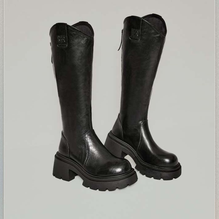 膝下まであるロングブーツは、スタイリッシュなシルエットと重厚感のある作りで、個性的な着こなしを演出。